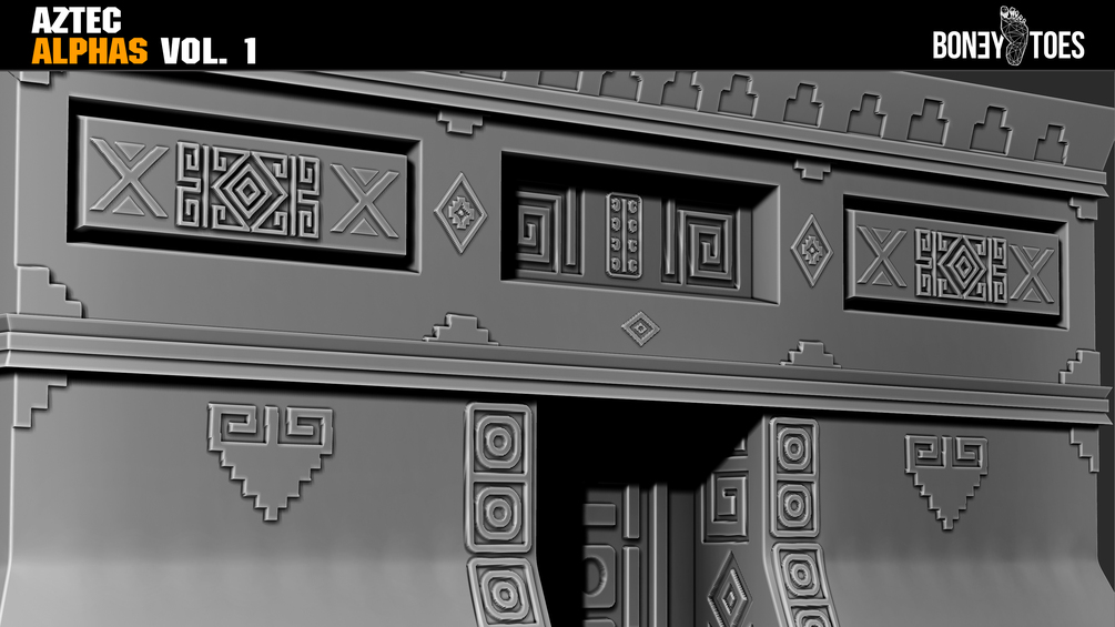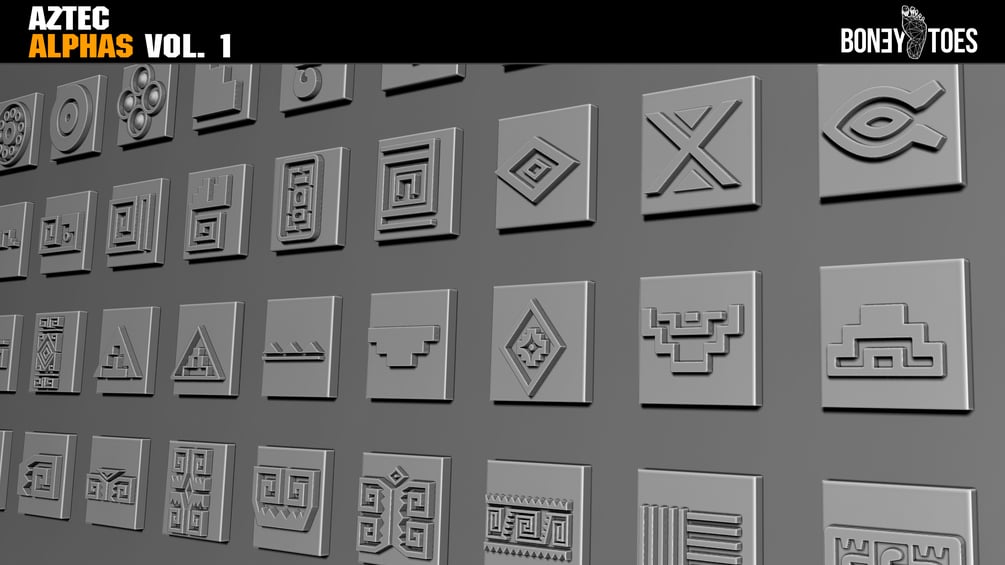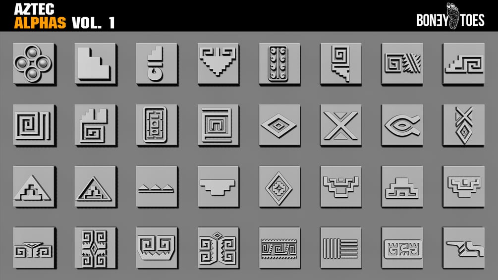 52 Aztec Designs and Shapes Alphas for use with Zbrush, Substance Painter, Quixel DDO, 3D Coat, ect. Ready for your Game Development or personal projects!